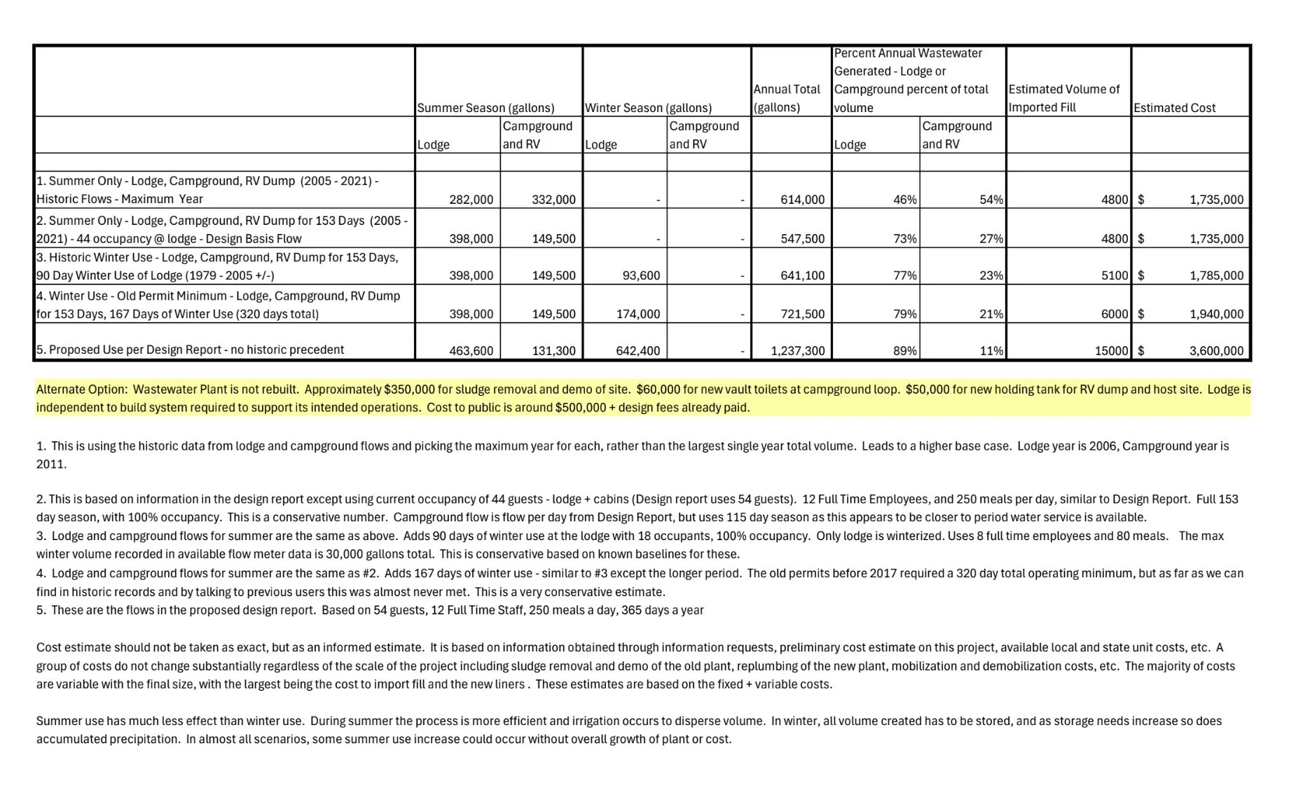 What drives the size of the plant is primarily “off-season” or “winter” use. The current USFS plan creates more “off season” waste water than the original POWDR proposal. The current proposal is 642,400 gallons for off season use. POWDR had previously proposed 476,640 gallons. Remember how massive that original expansion was?
